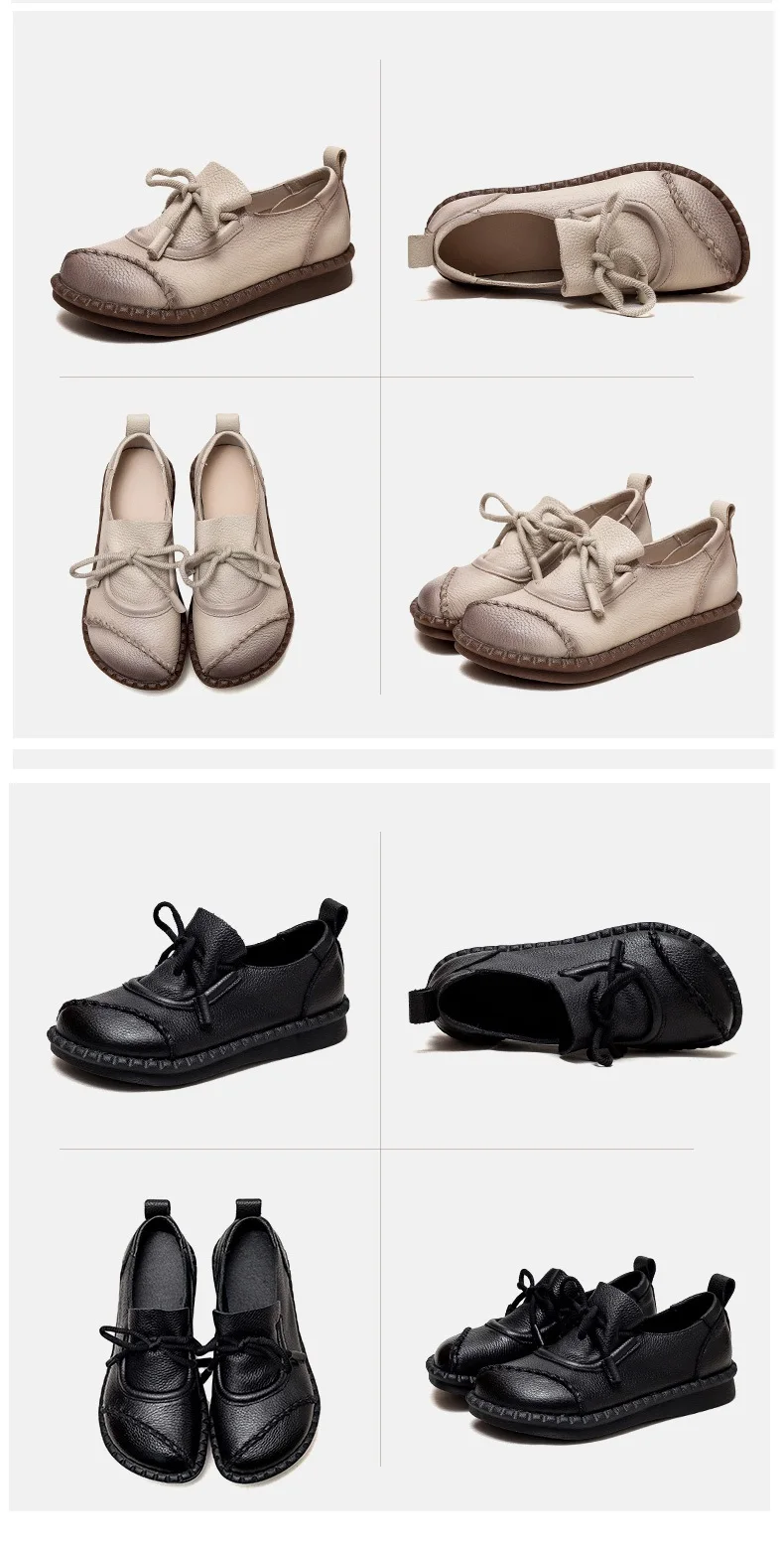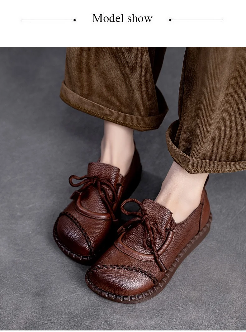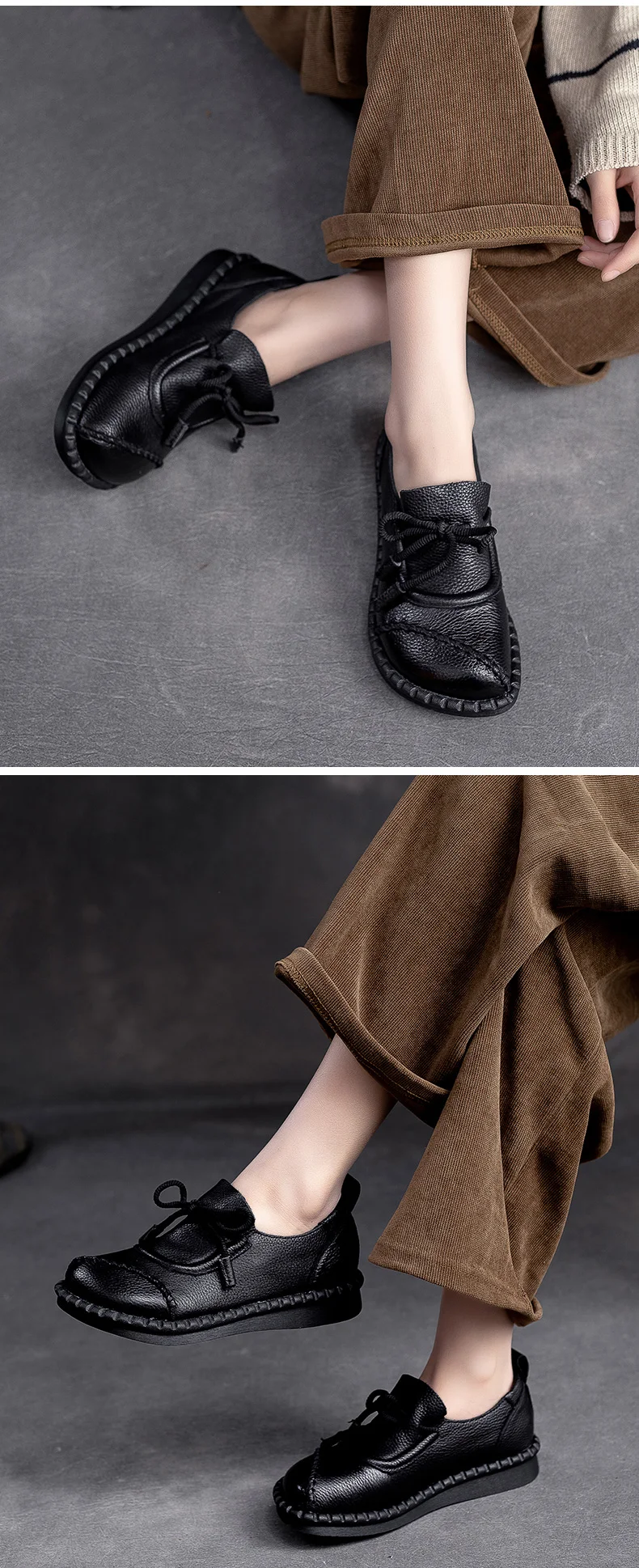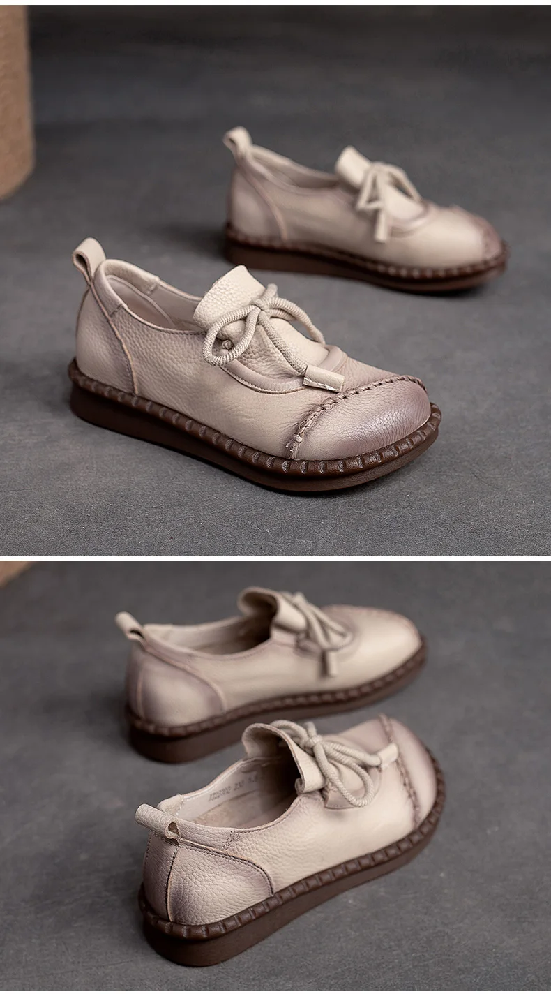 Women Flats Shoes 2024 New Spring Round Toe Lace-up Genuine Leather Casual Loafers Handmade Comfortable Shoes
