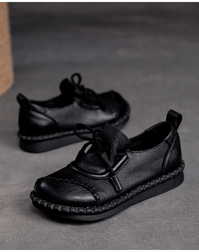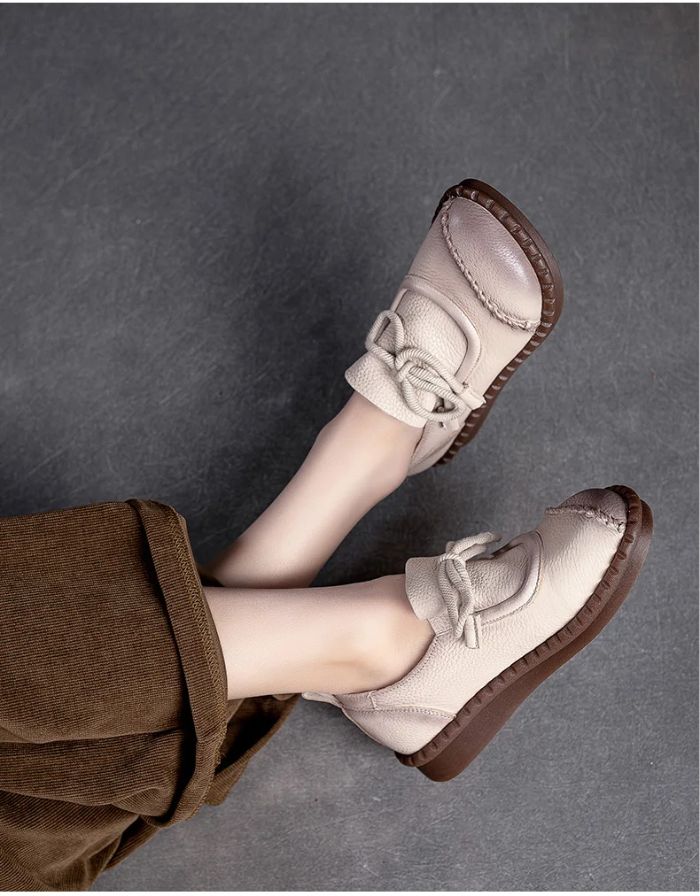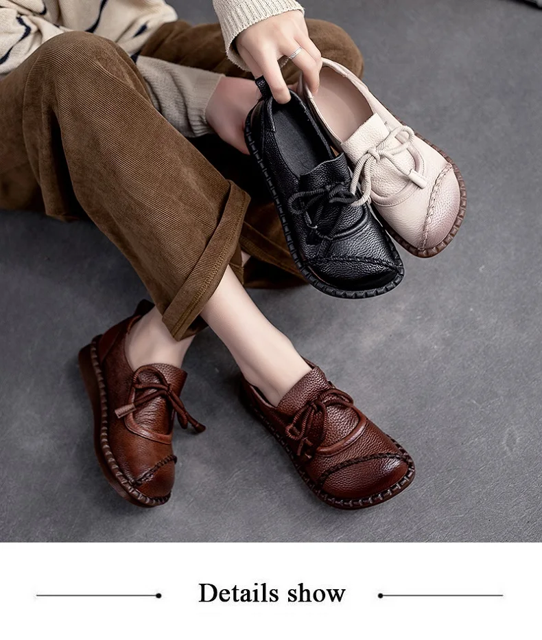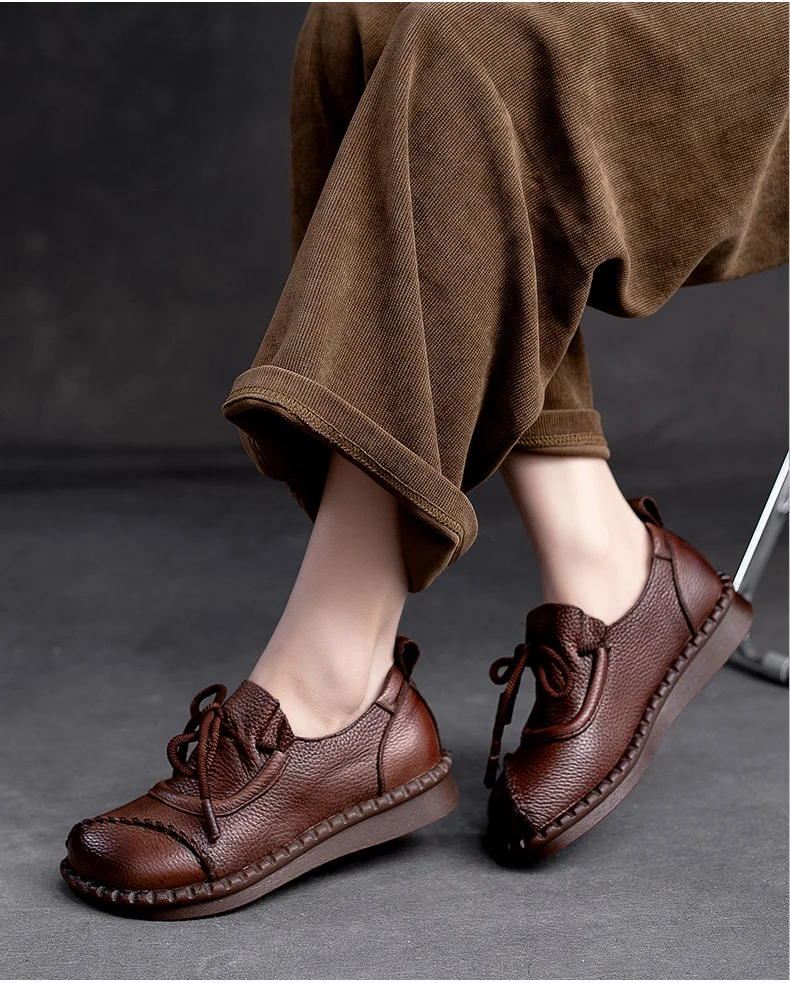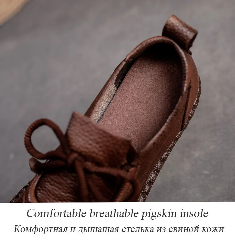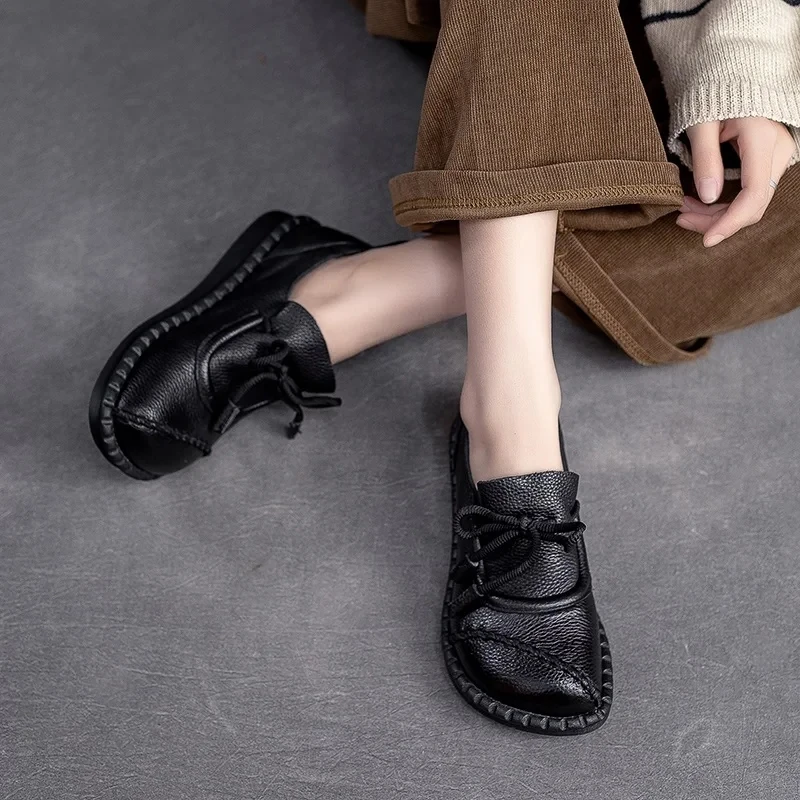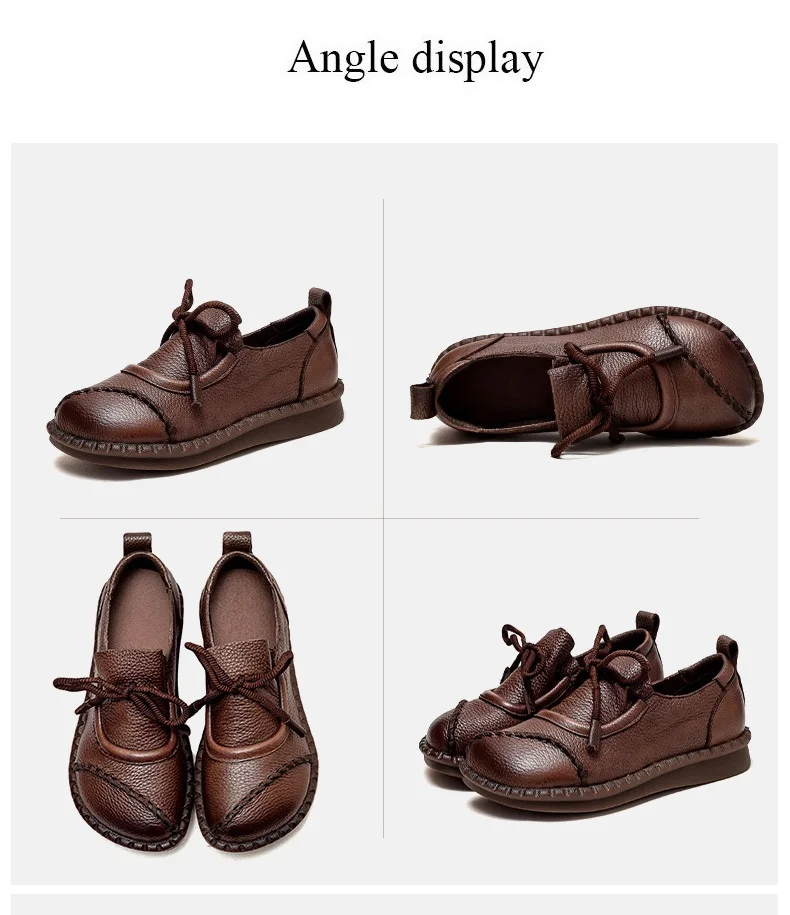 Women Flats Shoes 2024 New Spring Round Toe Lace-up Genuine Leather Casual Loafers Handmade Comfortable Shoes