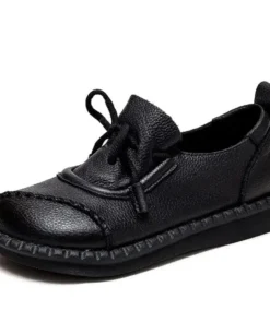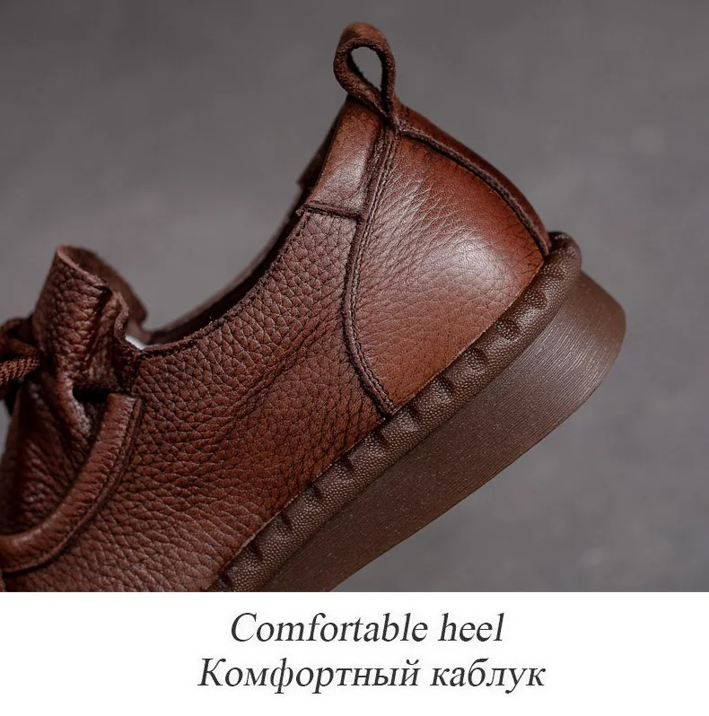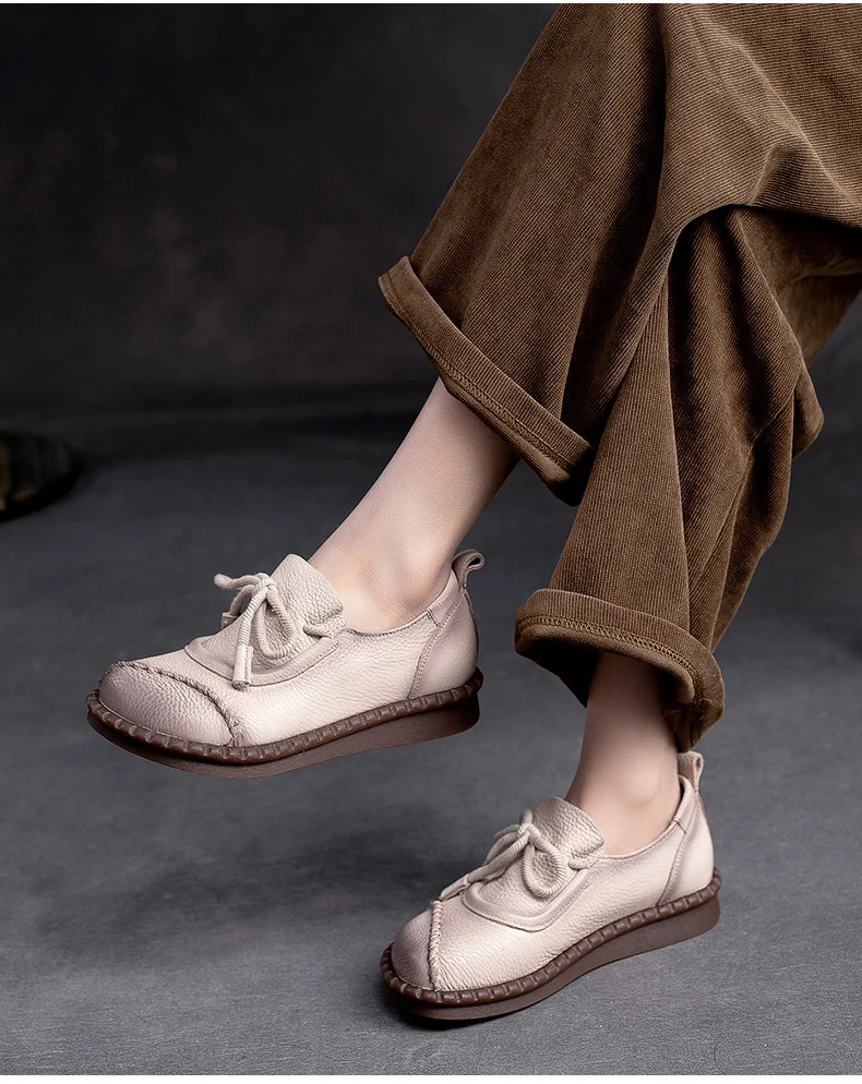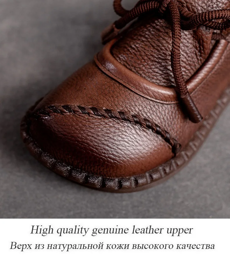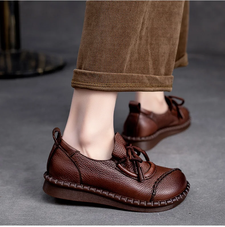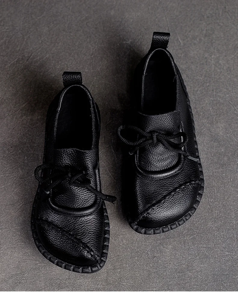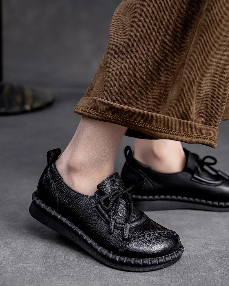 Women Flats Shoes 2024 New Spring Round Toe Lace-up Genuine Leather Casual Loafers Handmade Comfortable Shoes